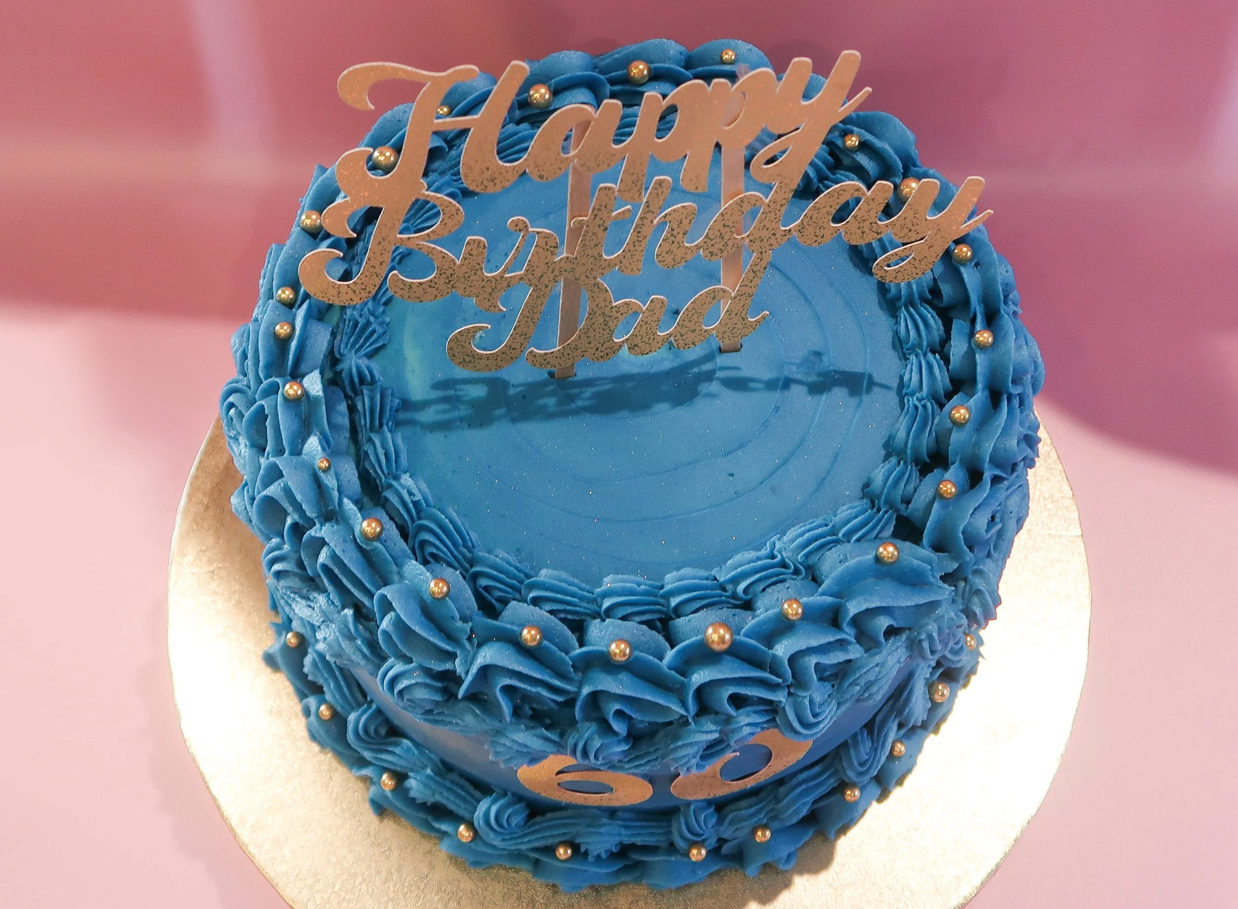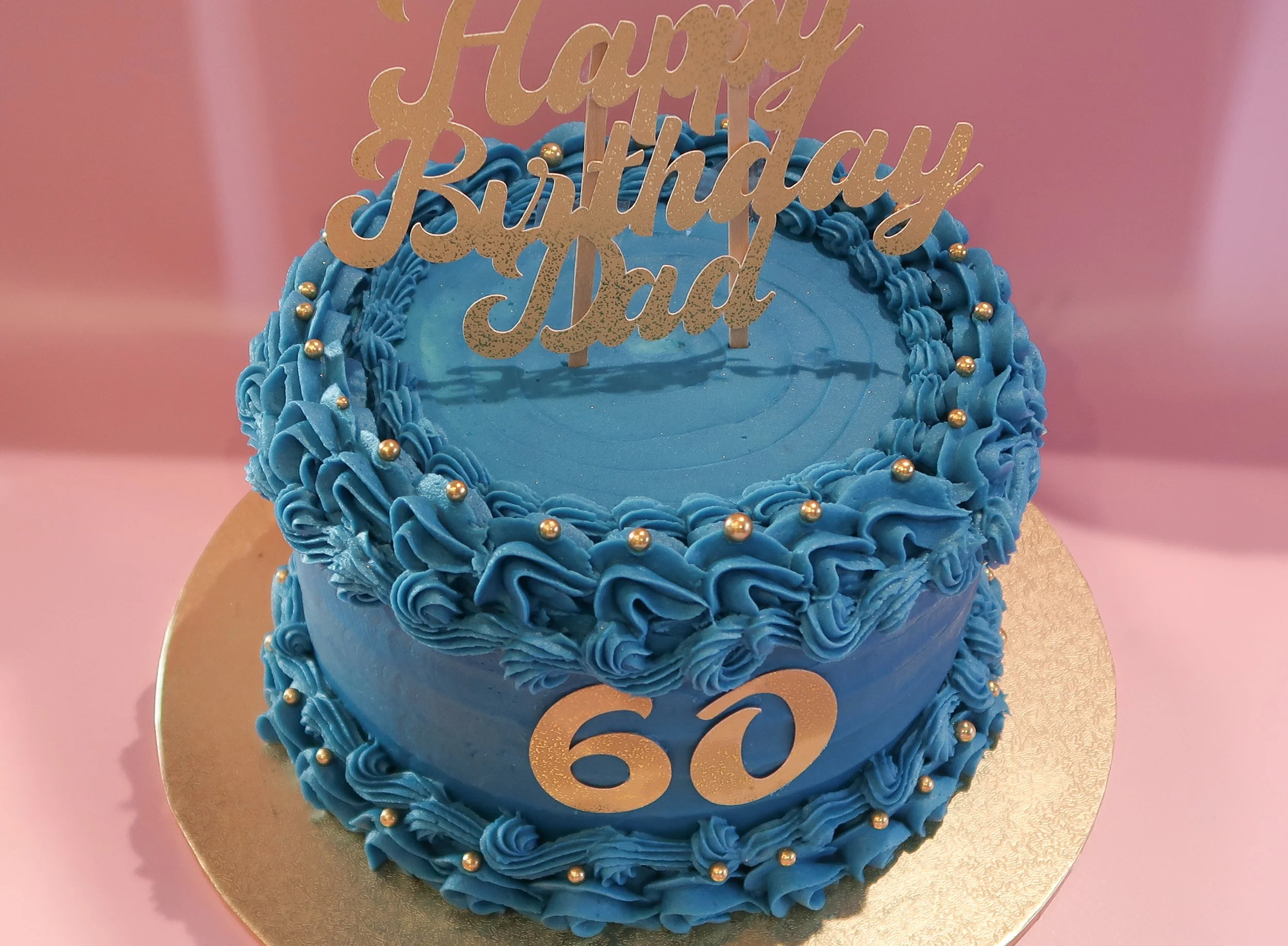 60th birthday cake made of 3 layers of chocolate fudge cake. Filled with rich, chocolate ganache and milk chocolate buttercream. Topped with blue buttercream, gold sprinkles and gold decorative toppers*.
